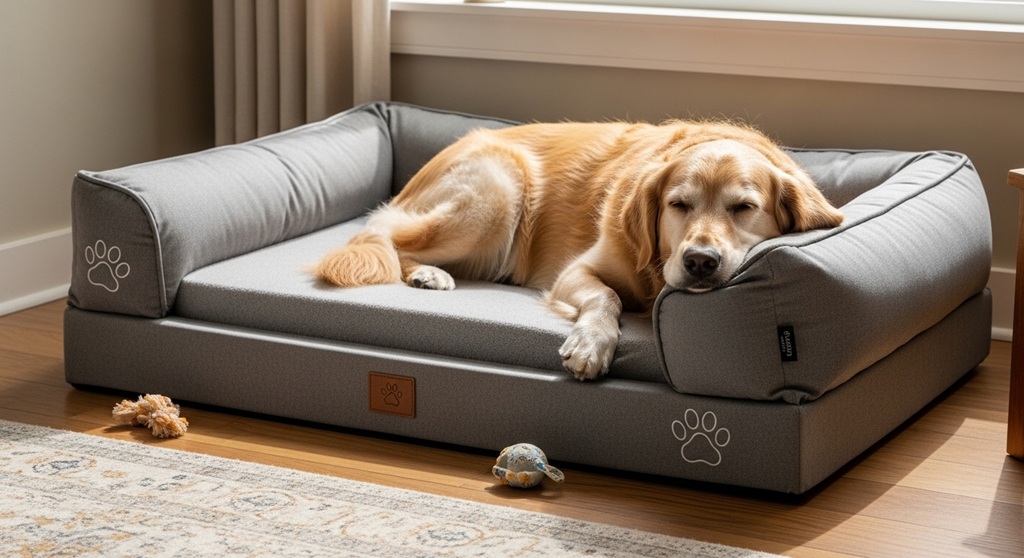 A proper pressure relief bed supports joints through the night. A quality senior dog bed protects aging hips and spine.