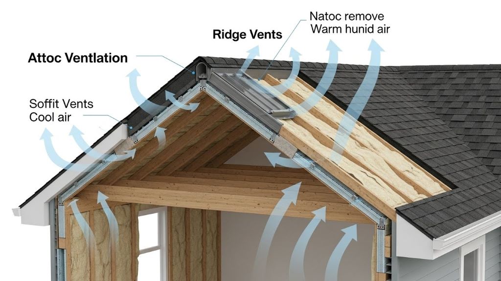 Attic ventilation system showing ridge vents and soffit vents working together to remove hot air naturally